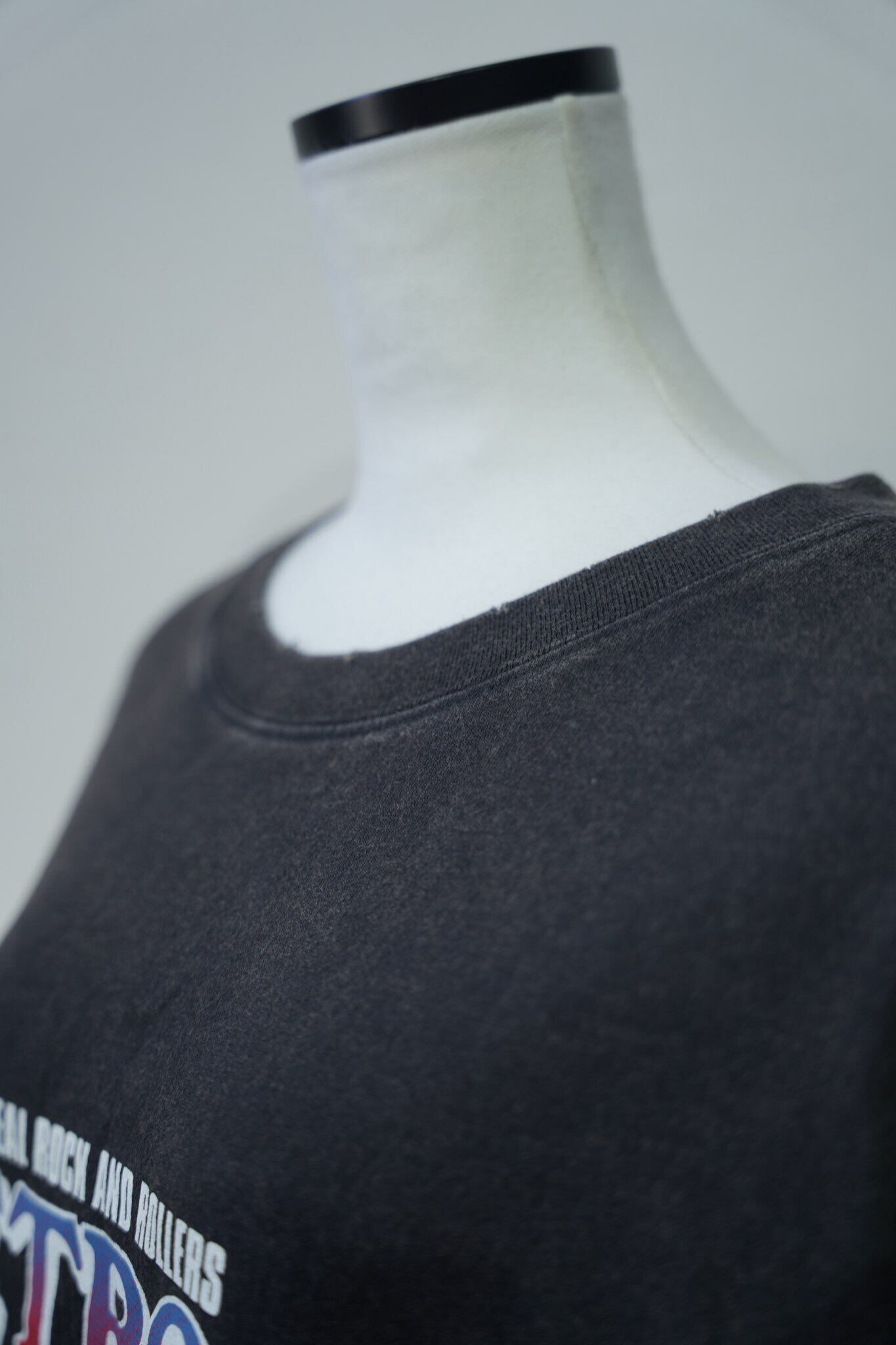 クラッシュ加工によるフェード感と、古着特有のやれた雰囲気がリアルなロックテイストを演出します。
