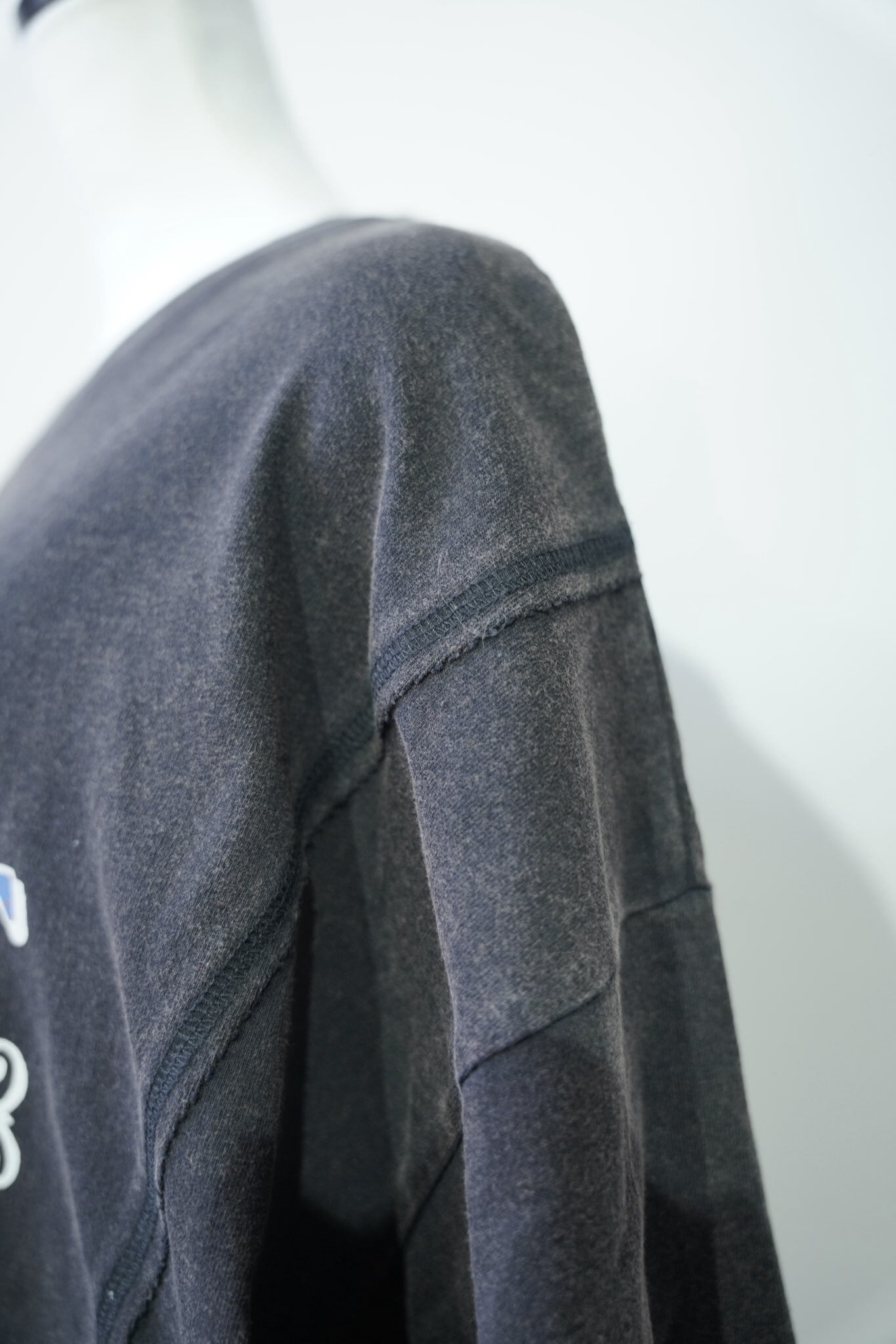 左右で異なるプリントを縫い合わせたデザインは、まるで2枚のバンドTシャツが融合したかのようなユニークな佇まい。