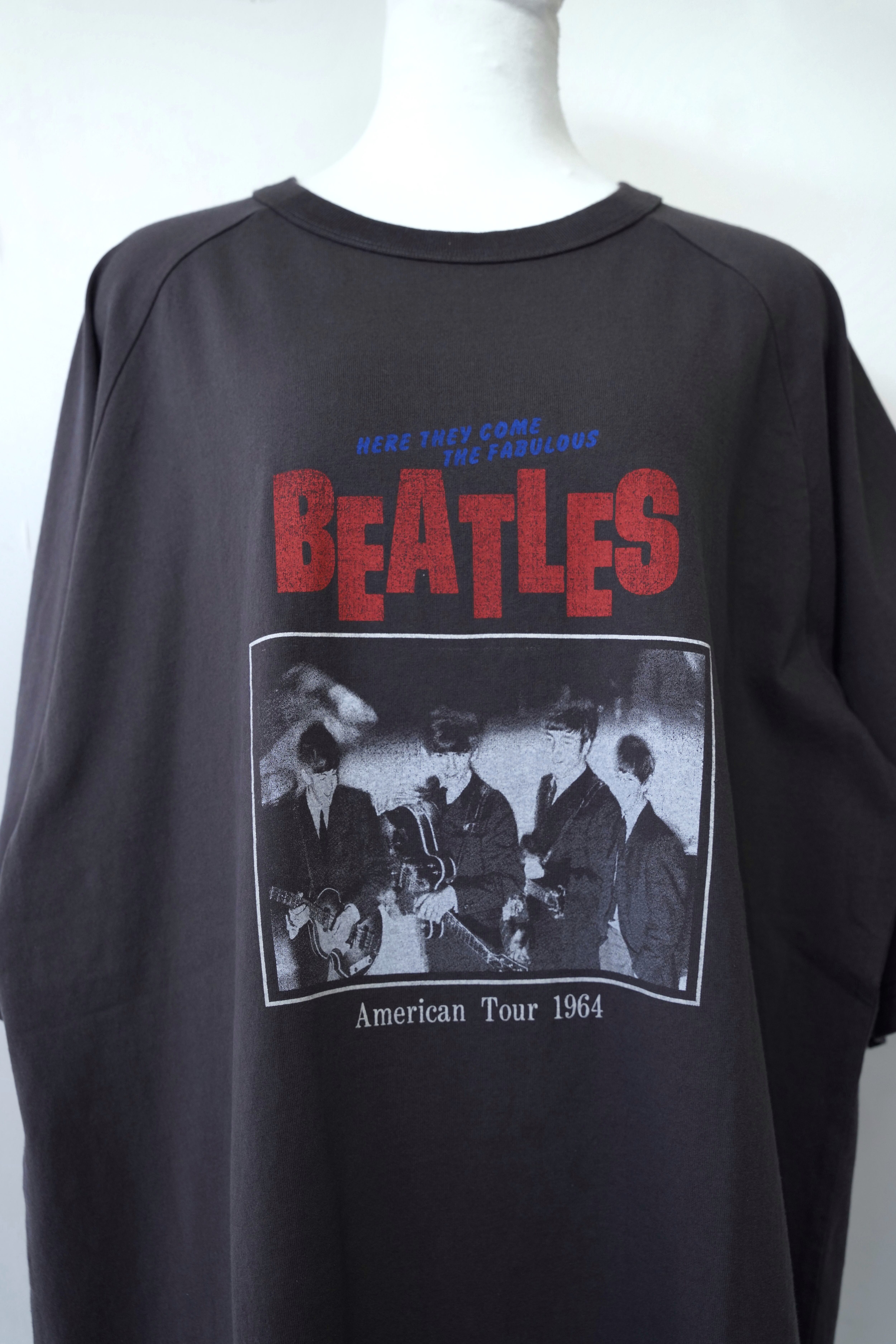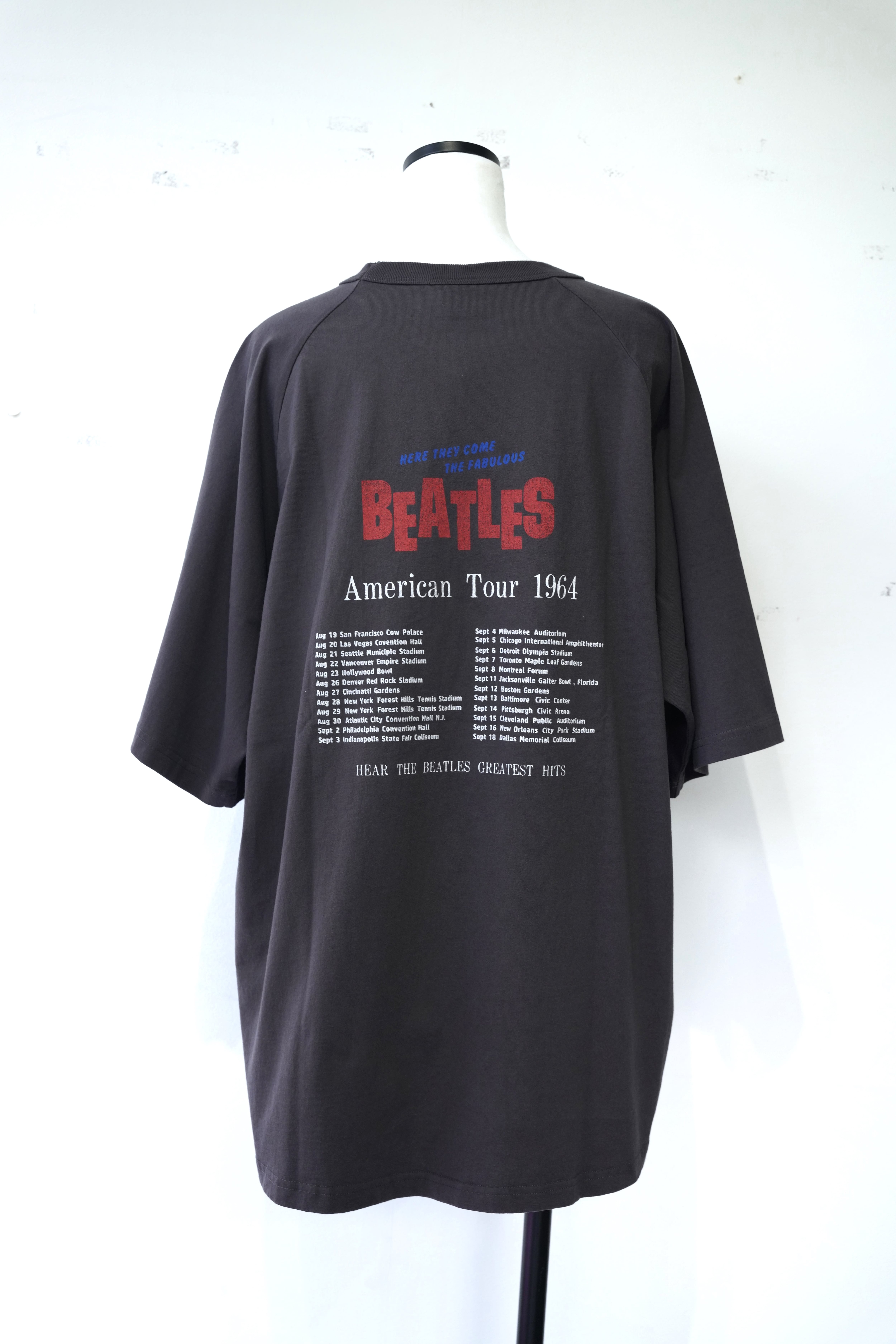 1964年に行われたビートルズのアメリカツアーを記念した、フロント&バックプリント仕様のグラフィックTシャツ。前面にはツアー当時の貴重なフォトと“THE FABULOUS BEATLES”の力強いロゴ、背面には全ツアー会場のリストが記載され、ライブTのような存在感あるデザインに仕上がっています。ヴィンテージ調のフェードブラックボディで、古着ミックスやモード系スタイルにもハマる万能アイテム。
