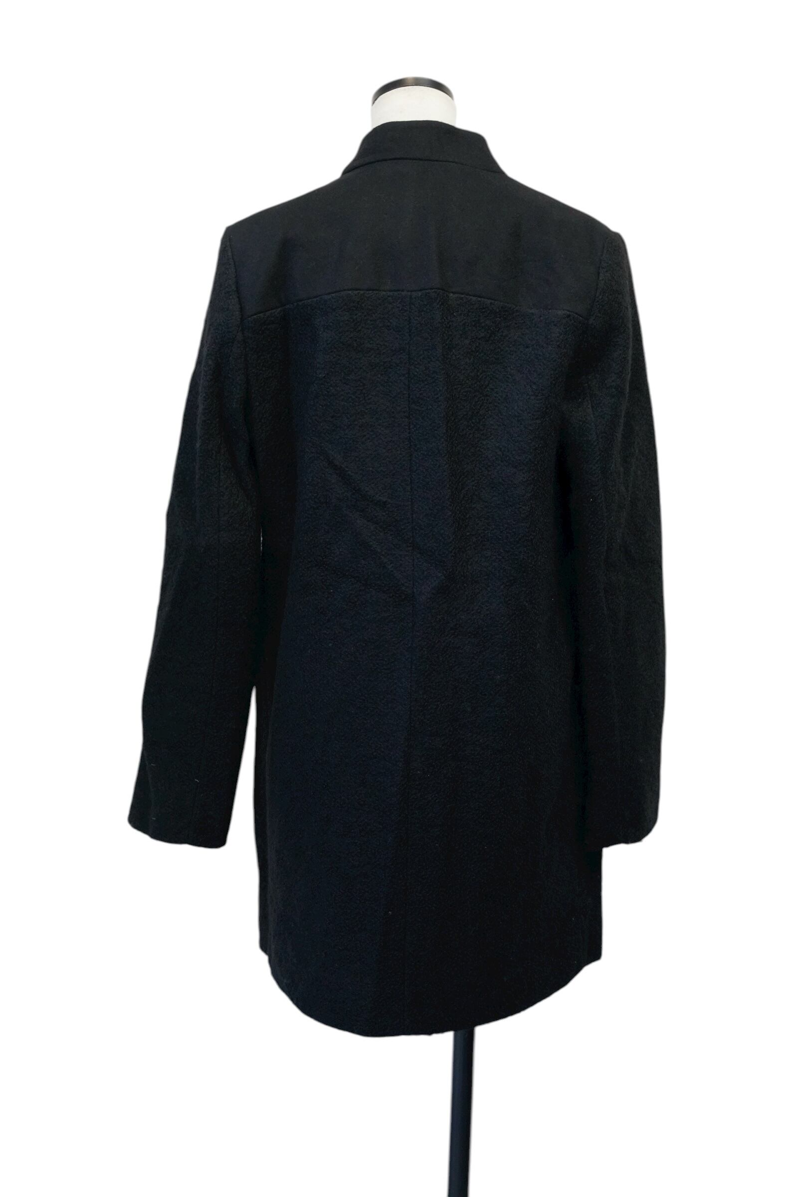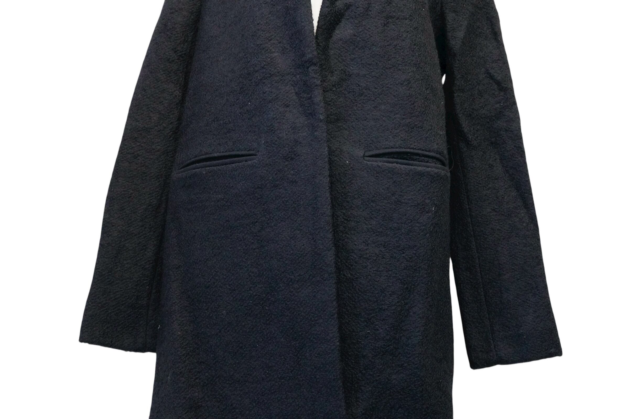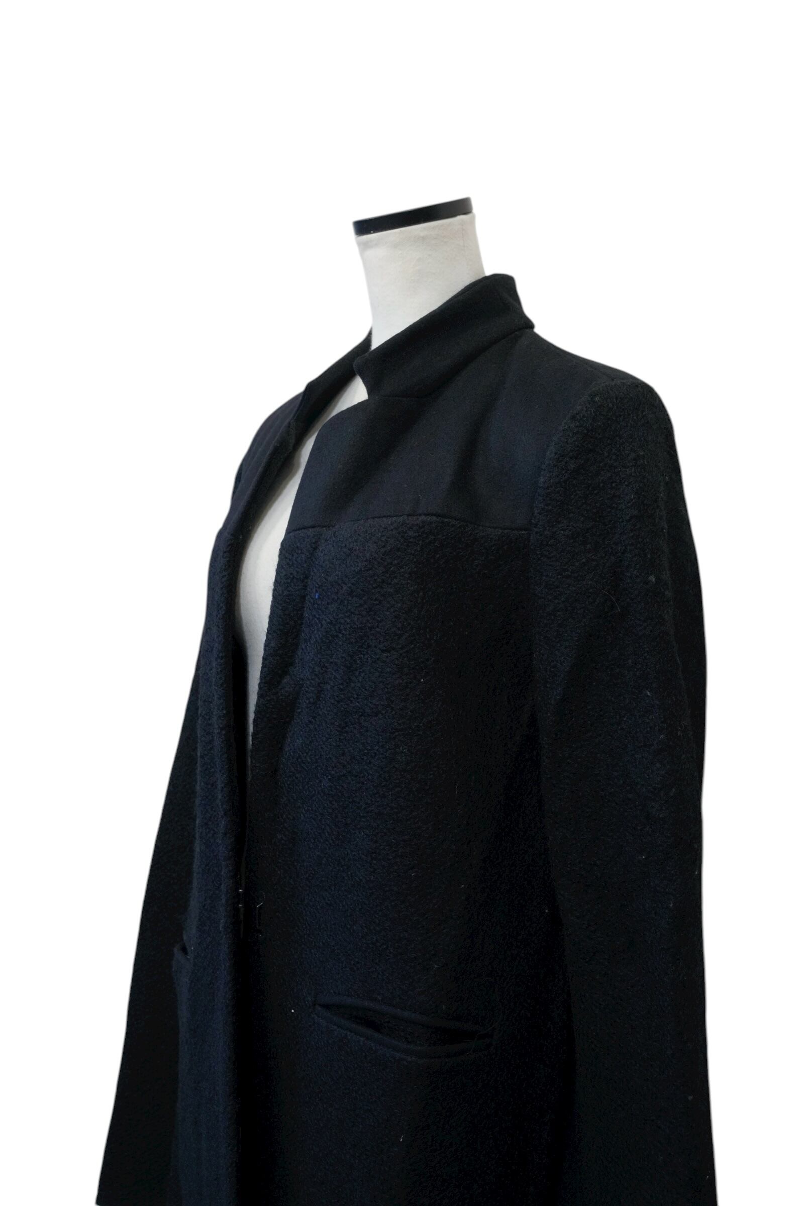 洗練されたミニマルデザインのブラックノーカラーコート。
