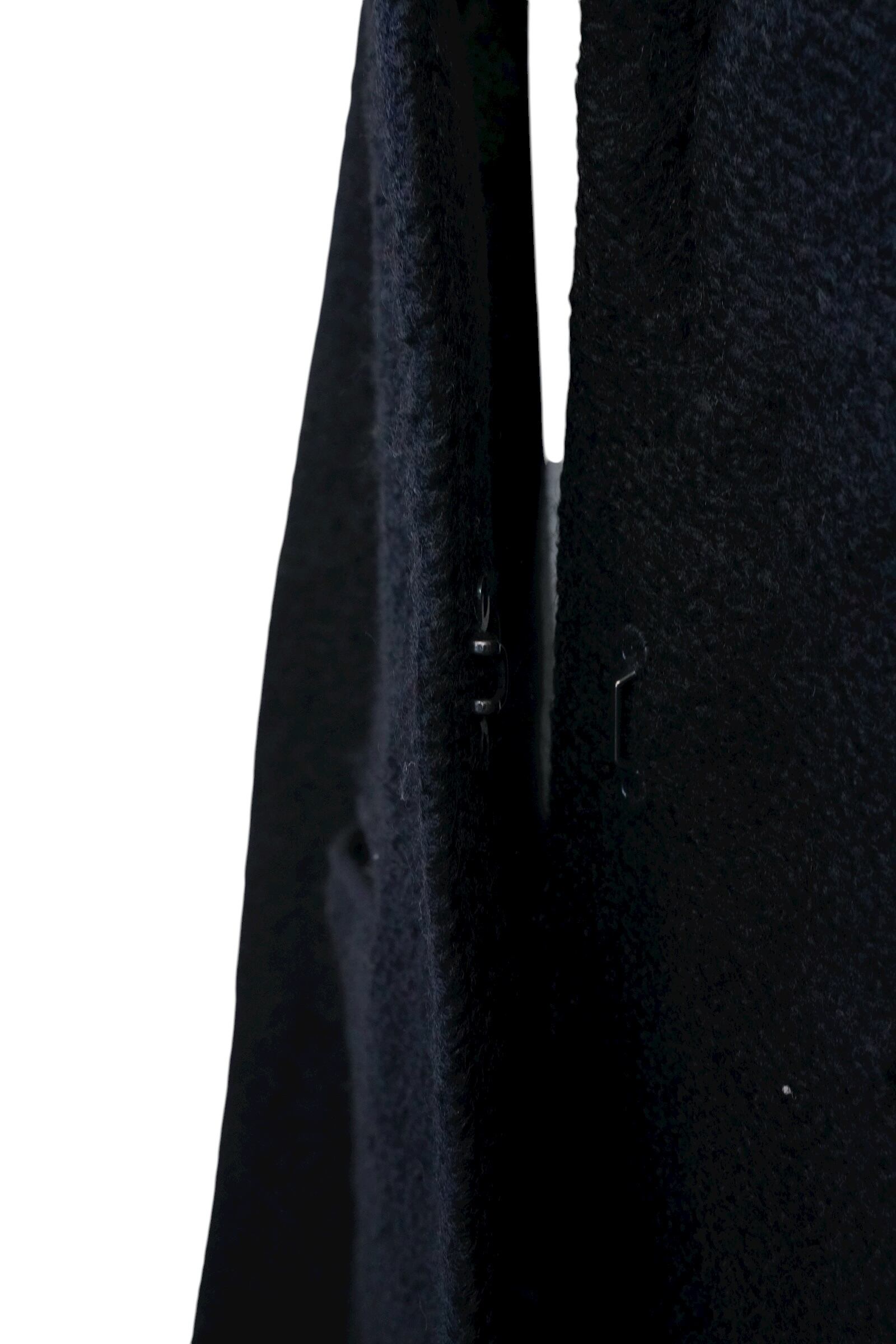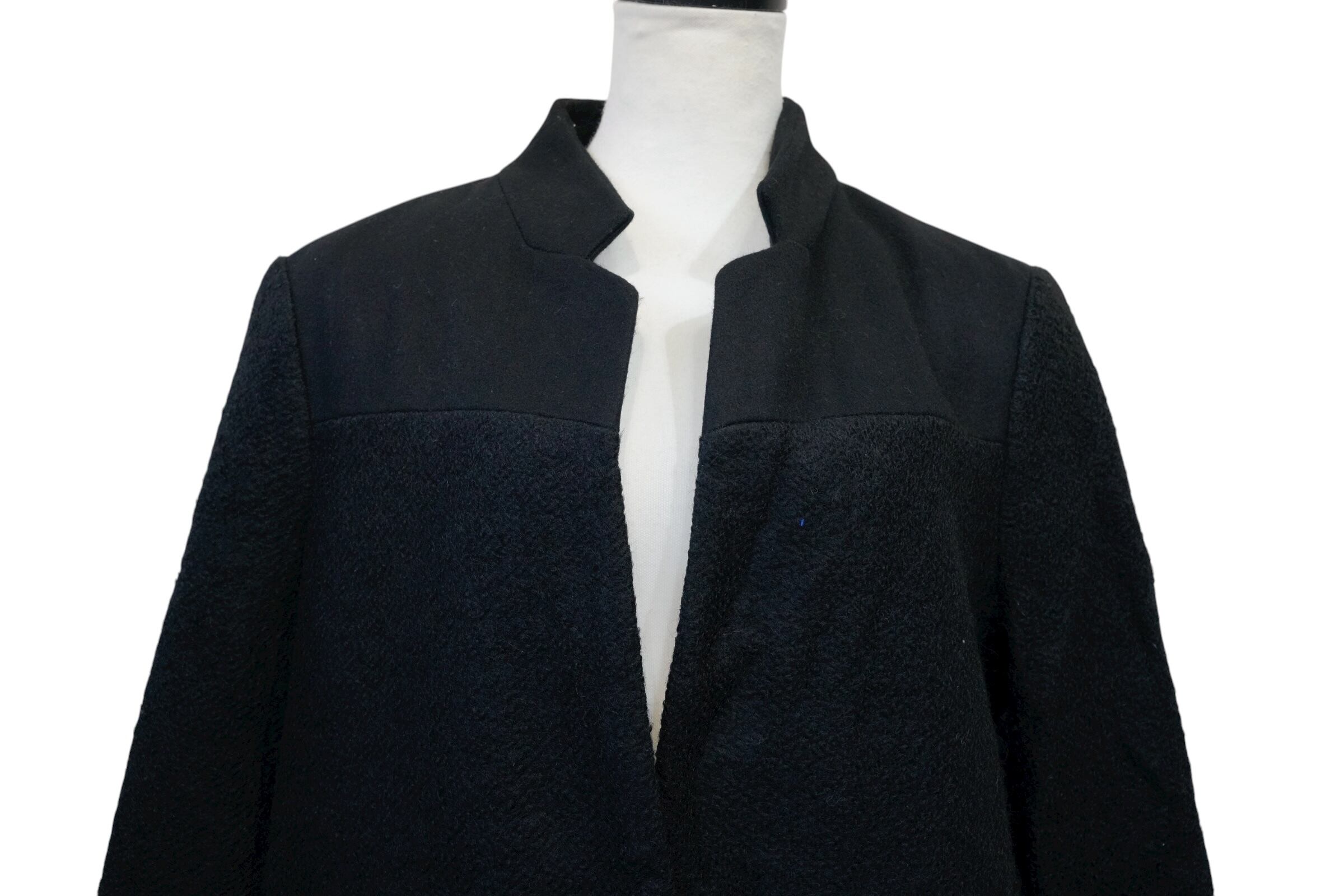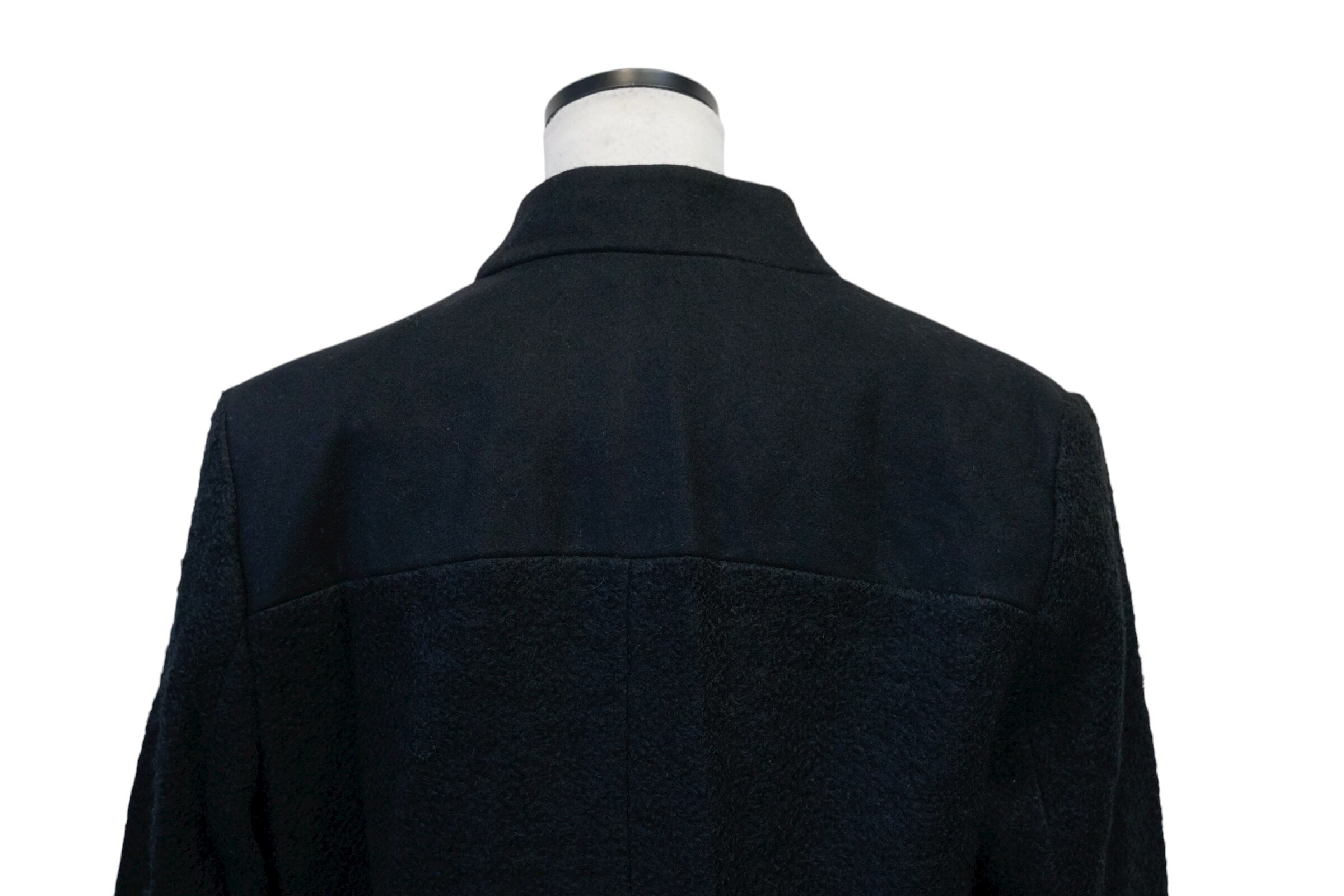 洗練されたミニマルデザインのブラックノーカラーコート。