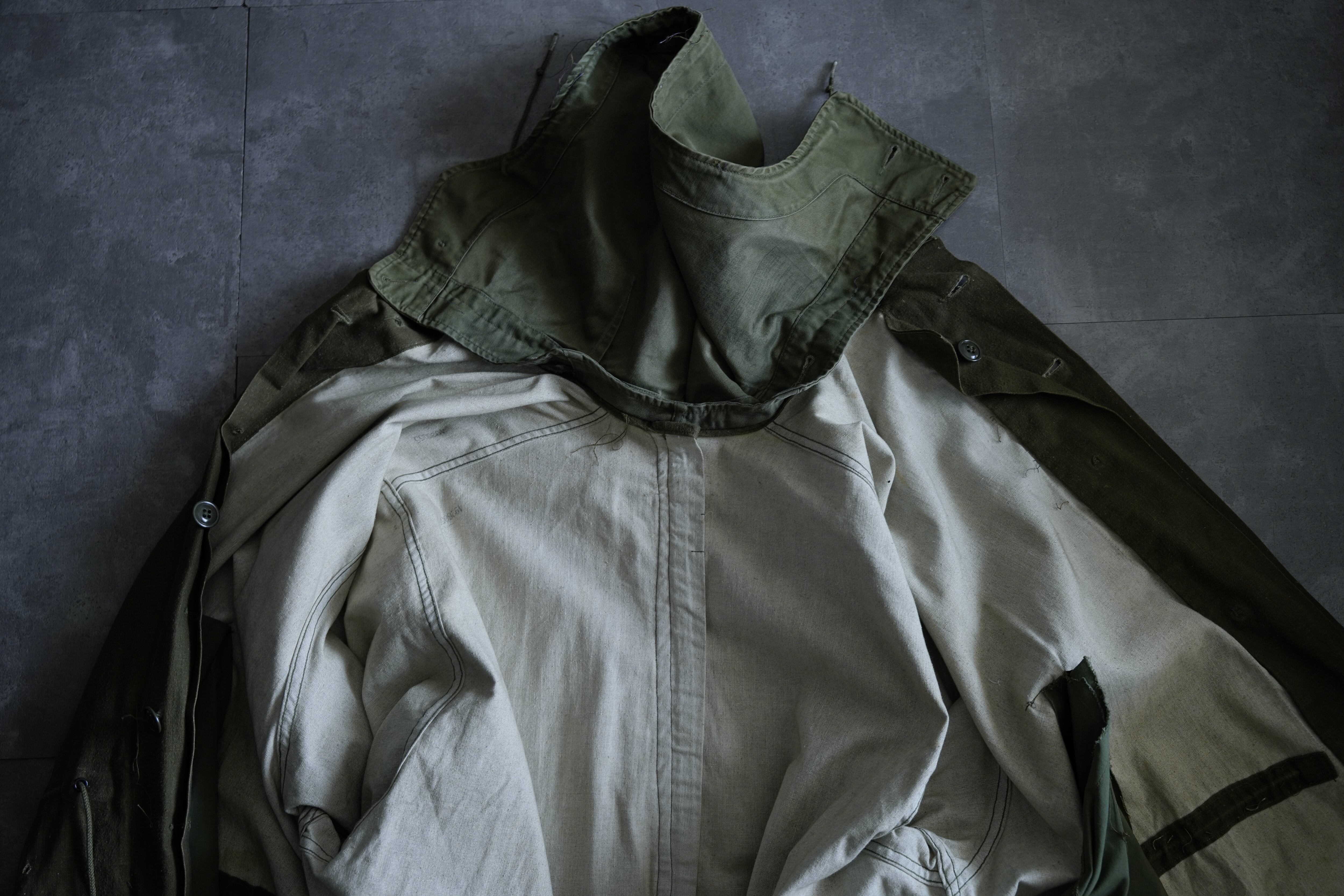 毒ガスから身を守る防毒コート、フロントはガスの侵入を防ぐため2重構造のガスフラップが付き、袖口はゴムで絞ったデザイン。